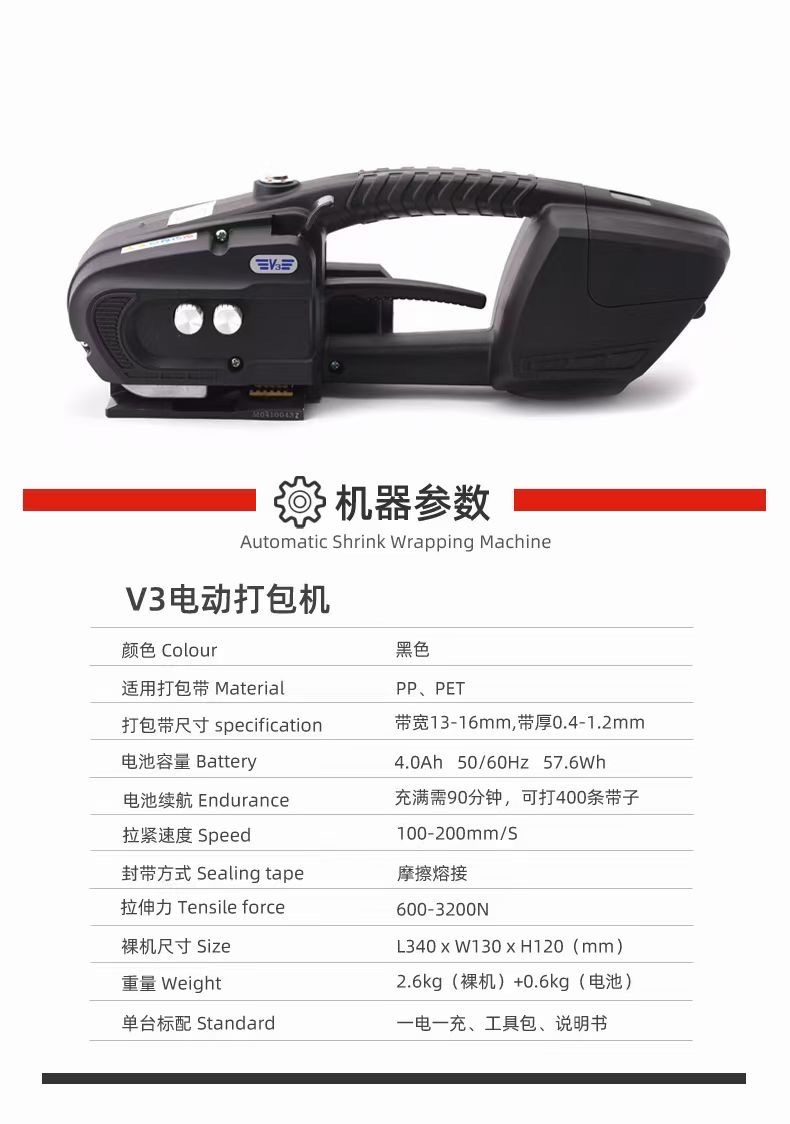电动打包机是指将打包带进行电动束紧、摩擦作扣、自动切带的捆扎方式的一种捆扎机械。将塑钢带或塑料打包带,从上往下缠绕捆包物体一圈后,将打包带接头处放入机器工作槽内,由电机带动束紧轮,将打包带束紧,通过摩擦作扣的方式将带粘接,最后自动进行切带。
